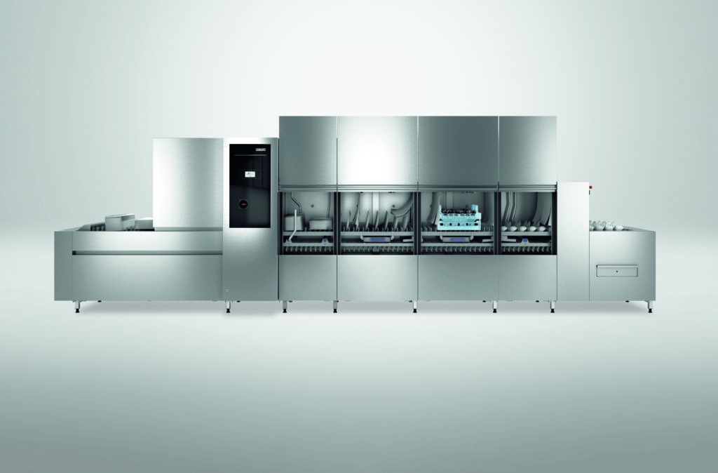 Die Bandspülmaschine ist die erste Bandspülmaschine, die mit Hilfe von künstlicher Intelligenz beim Spülen unterstützt. Wasch- und Spülparameter sowie die Bandgeschwindigkeit werden dabei automatisch an die Erfordernisse des Spülguts angepasst.