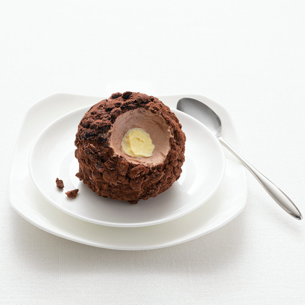Der Tartufo Classico kombiniert halbgefrorenes Schokoladengelato mit einem zartschmelzenden Zabaione-Kern, ummantelt von Kakaopulver und knusprig-kandierten Haselnussstückchen.