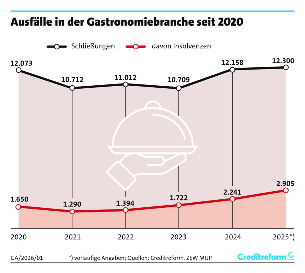 Creditreform spricht von einer „Dauerkrise in der Gastronomie“. In den Jahren 2024 und 2025 gaben bundesweit rund 24.500 Gastronomiebetriebe auf. Sowohl die Zahl der Unternehmensschließungen als auch die Insolvenzzahlen steigen weiter an. Eine Untersuchung von Creditreform zeigt, dass die Branche deutlich stärker betroffen ist als die Gesamtwirtschaft.