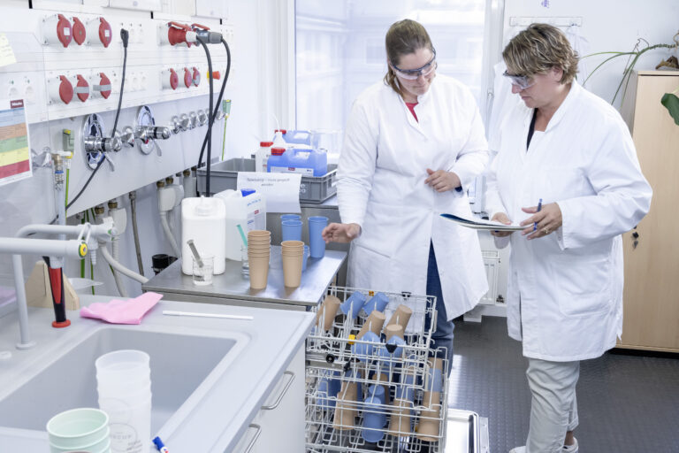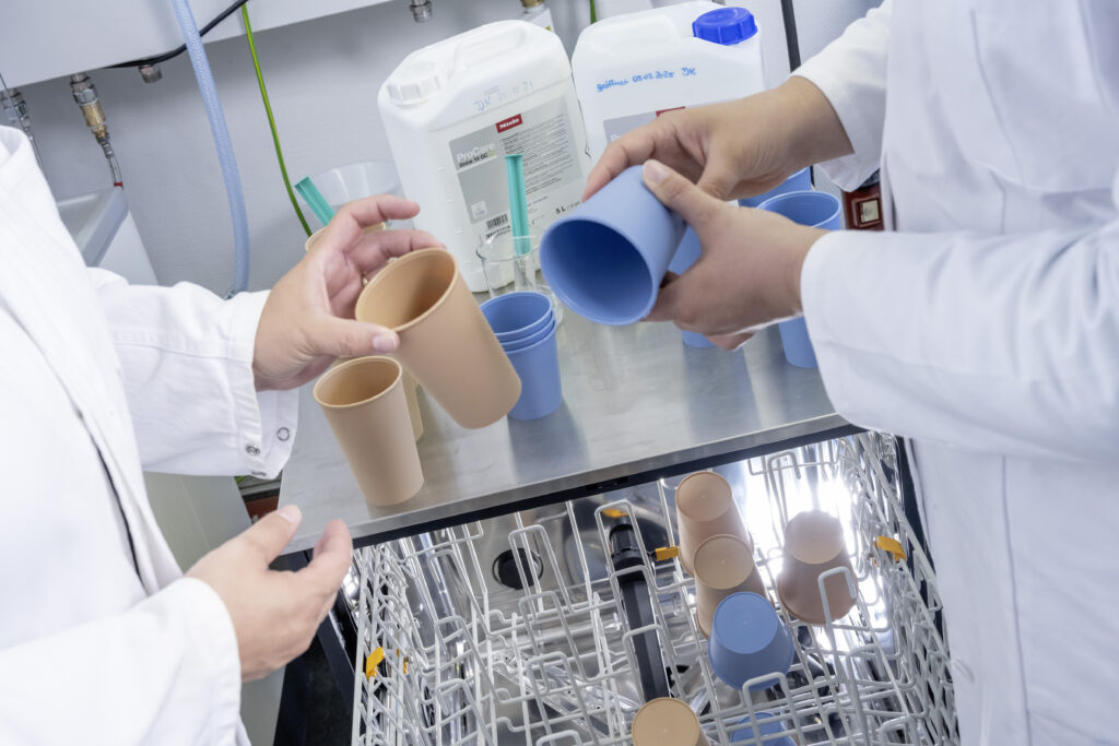 Neben dem Anspruch, für Endkonsumenten ein Höchstmaß an Sicherheit im Alltag zu gewährleisten, steht für Diana Klapper das Thema Benutzerfreundlichkeit im Mittelpunkt. Gemeinsam mit ihrer Kollegin Mathilde van Rheenen testet sie, unter welchen Bedingungen eine gewerbliche Spülmaschine Mehrwegbecher nicht nur hygienisch reinigt, sondern auch zuverlässig trocknet. Ein spezieller Korb mit passenden Halterungen, der im CSA-Labor anwendungstechnisch geprüft wurde und mittlerweile auf dem Markt ist, sorgt dabei für definierte Bedingungen. Häufig werden Becher verschiedener Hersteller eingesetzt, deren Restfeuchte unter Realbedingungen zu testen ist. Nach Programmende steht dabei jeder einzelne Mehrwegbecher auf dem Prüfstand, denn feucht gelagerte Mehrwegbecher gelten als Hygienerisiko und können Keime übertragen.