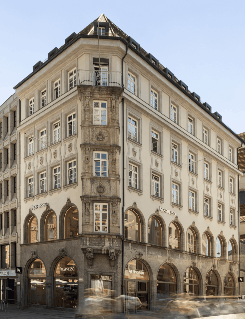 Das Nespresso House erstreckt sich über zwei Etagen. Im Erdgeschoss befindet sich eine Kaffeebar im Lounge-Stil, großzügige Präsentations- und Verkaufsflächen sowie ein To-go-Fenster zum Marienplatz, das den schnellen Kaffeegenuss für Passanten ermöglicht. Eine Außenterrasse ergänzt das Angebot. Neben dem gewohnten Sortiment an Premium-Kaffees schafft die neue Location Raum für Masterclasses, Produktneuheiten und individuelle Beratung durch spezialisierte Mitarbeiterinnen und Mitarbeiter.