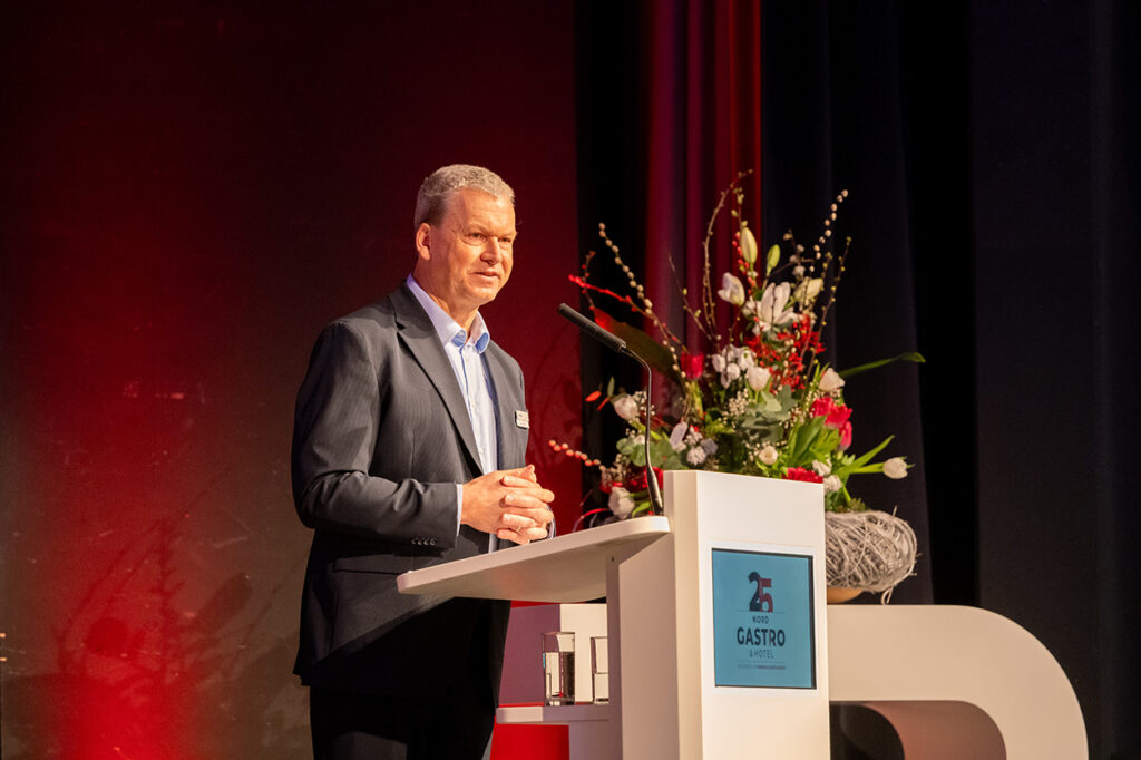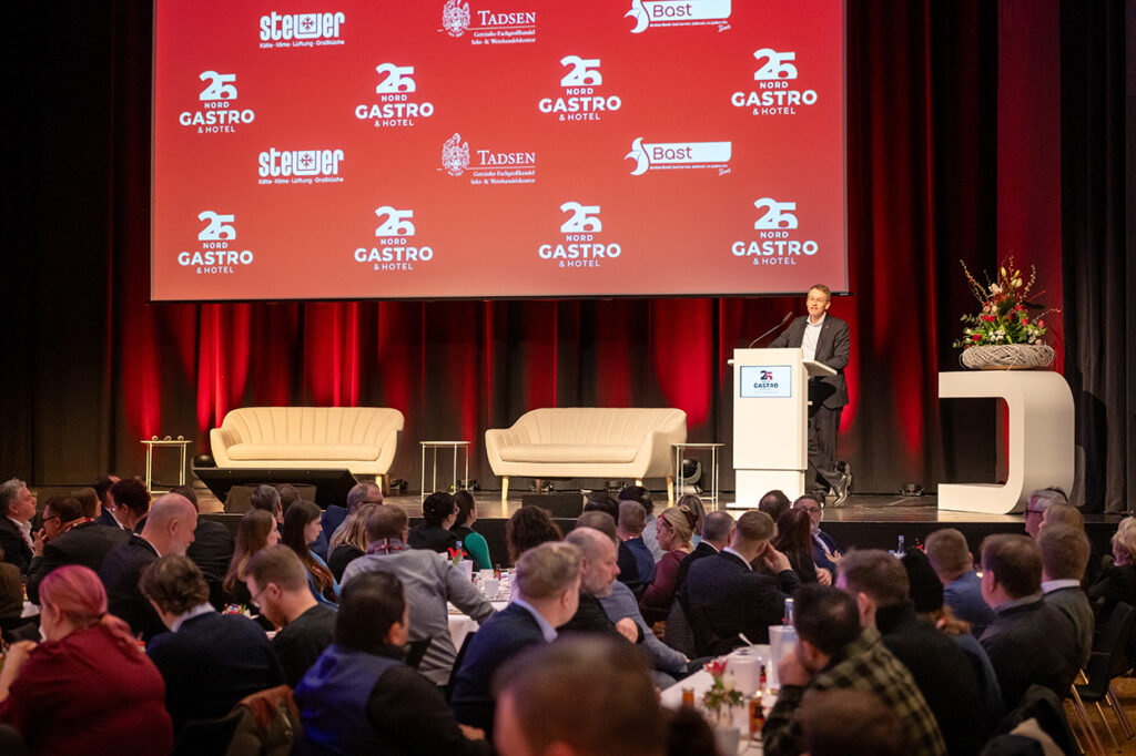 Schleswig-Holsteins Ministerpräsident Daniel Günther sprach zum Auftakt der Jubiläumsmesse Nord Gastro & Hotel vor rund 200 geladenen Eröffnungsgästen. Er sagte: „Die wichtigen Wirtschaftskräfte versammeln sich immer wieder hier in Husum.“ Weiter erklärte Daniel Günther: „Die Nord Gastro setzt seit 25 Jahren wichtige Impulse für das Gastgewerbe in Schleswig-Holstein. Sie ist ein wichtiger Ort für Austausch und Vernetzung und zeigt, wie fortschrittlich und kreativ die Branche bei uns im Land ist.“