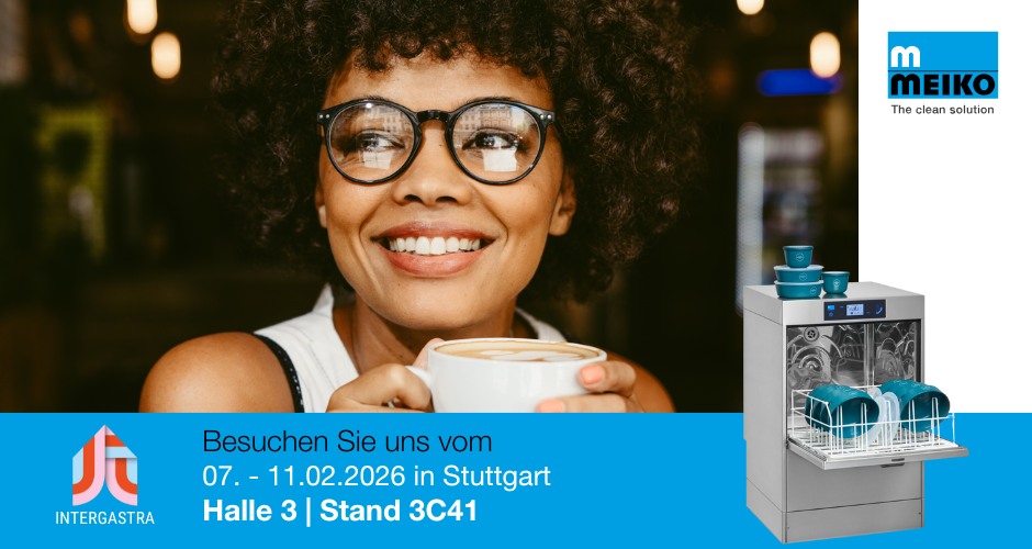 Meiko zeigt auf der Intergastra integrierte Spülraumlösungen für Mehrweg, Speisereste-Management und eine neue Korbtransport-Spülmaschine. Halle 3, Stand C41