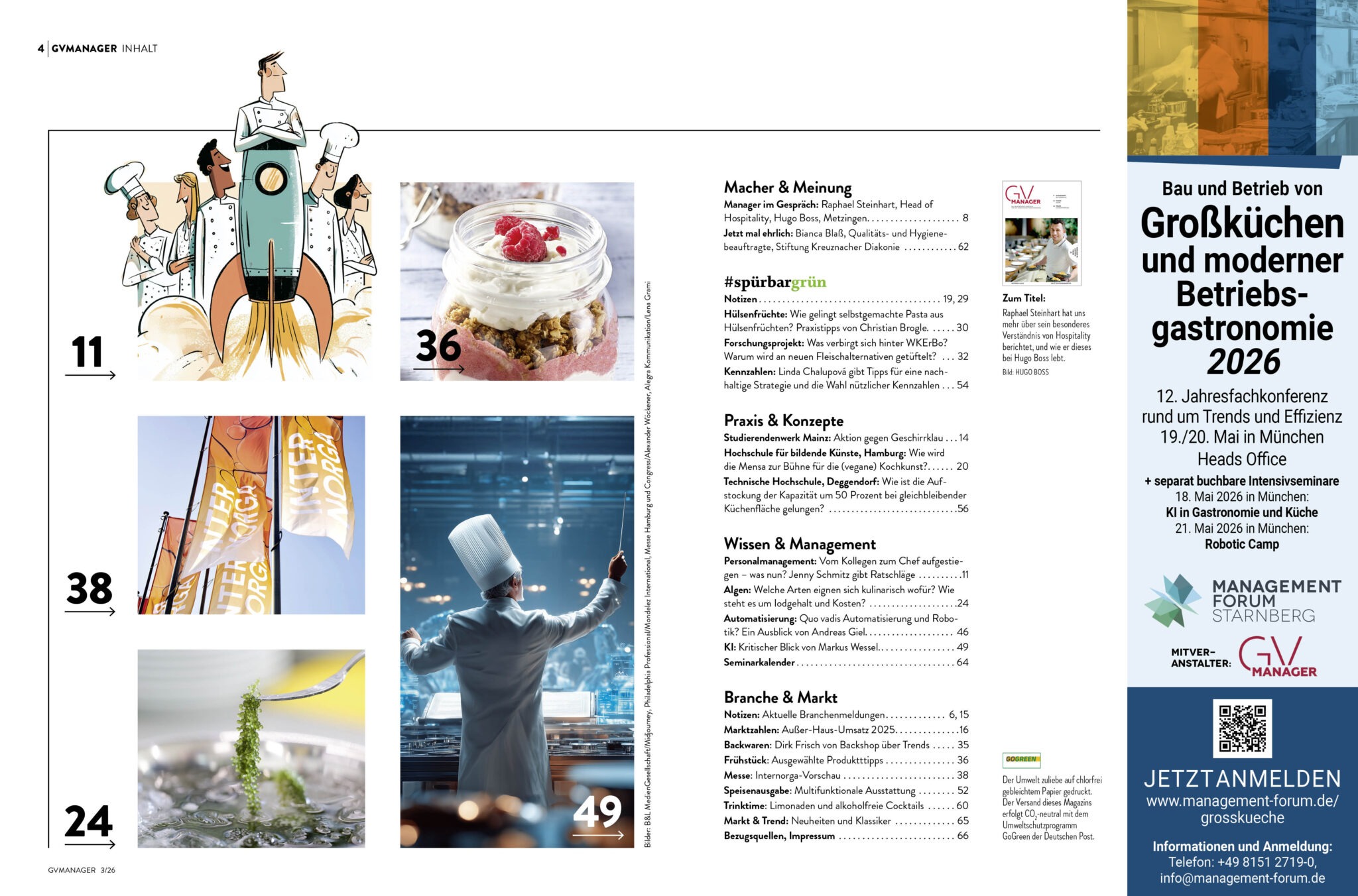 Darüber hinaus gibt in GVMANAGER 3/2026 ab S. 8 Raphael Steinhart Einblick hinter die Kulissen der Betriebsgastronomie von Hugo Boss. Der Head of Hospitality berichtet, warum er, wie auf dem Titelcover abgebildet, trotz seiner Führungsposition noch immer regelmäßig und gerne im Service unterstützt. Er berichtet über sein besonderes Verständnis von Hospitality und wie diese bei Hugo Boss gelebt wird. Nicht zuletzt klärt er auf, was es mit seinem Motto „Hotel ohne Zimmer“ auf sich hat.